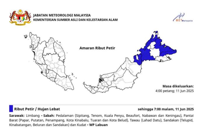 “Selain itu,  ribut petir, hujan lebat dan angin kencang turut dijangka berlaku di Sandakan melibatkan Telupid, Kinabatangan, Beluran dan Sandakan serta Kudat dan Labuan sehingga jam 7 malam ini,” menurut kenyataan itu di sini pada Rabu.