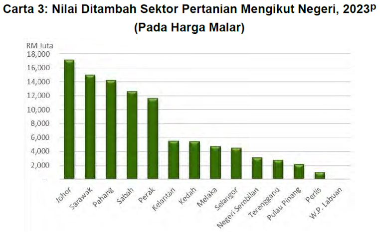 Daripada segi sumbangan mengikut negeri, Johor mencatat peratusan tertinggi (17.1%) diikuti Sarawak (14.9%), Pahang (14.1%), Sabah (12.5%) dan Perak (11.6%). Kelima-lima negeri ini secara kolektif menyumbang 70.2% kepada keseluruhan sektor pertanian negara.