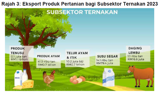 Laporan banci turut menunjukkan industri ayam negara mencatat nilai eksport memberangsangkan, iaitu RM1.4 bilion — merangkumi eksport produk ayam dan telur ayam/itik. Ini menunjukkan pemulihan ketara selepas kerajaan melaksanakan subsidi besar-besaran bagi menstabilkan harga semasa krisis bekalan.
