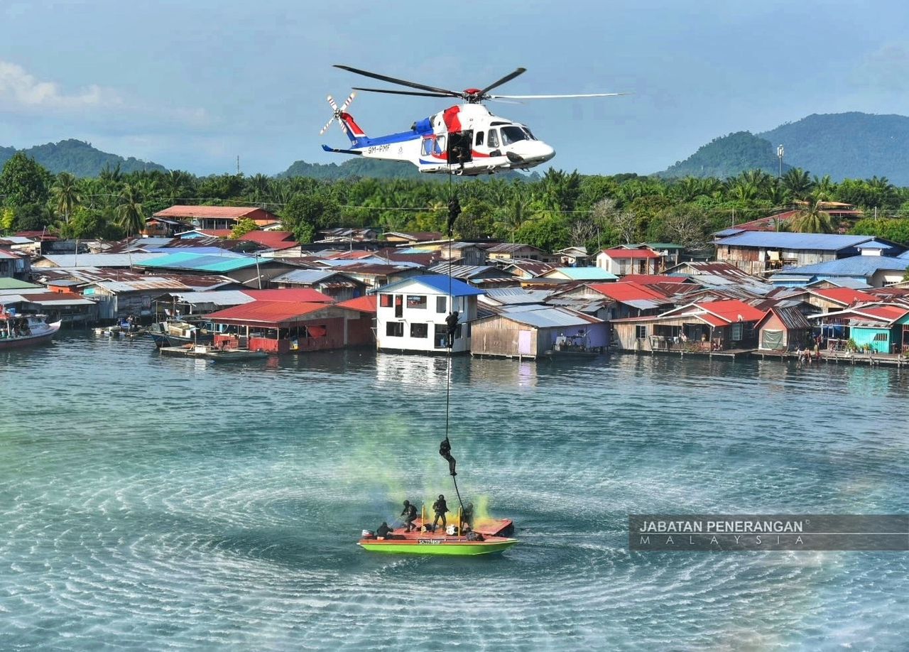 Helikopter Polis menurunkan pegawai penyelamat dalam simulasi penyelamatan yang dipersembahkan dalam acara tersebut.