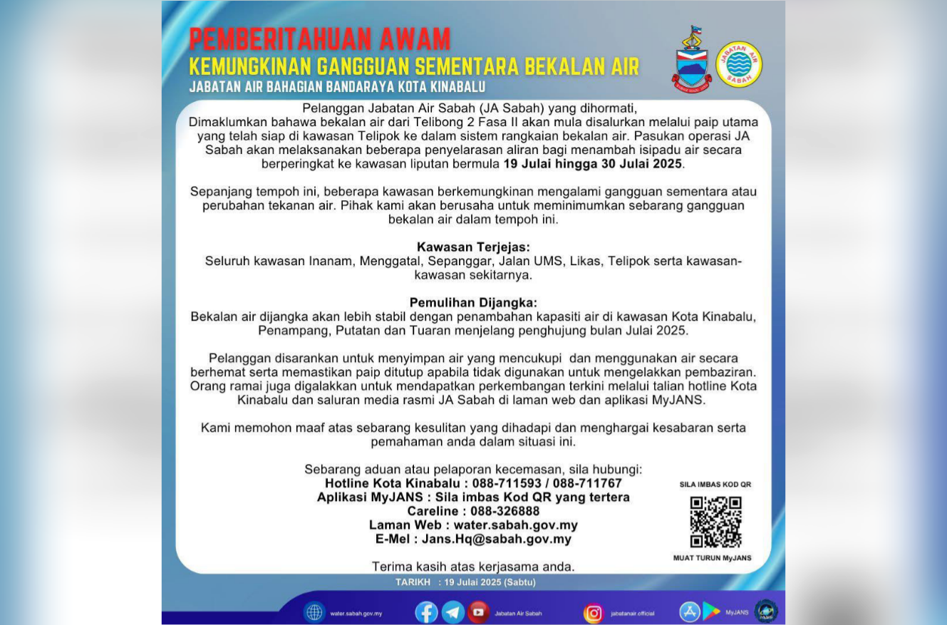“Orang ramai juga digalakkan untuk mendapatkan perkembangan terkini melalui aplikasi MyJANS, laman web rasmi JANS (water.sabah.gov.my) dan saluran media sosial JANS,” menurut kenyataan itu di sini/