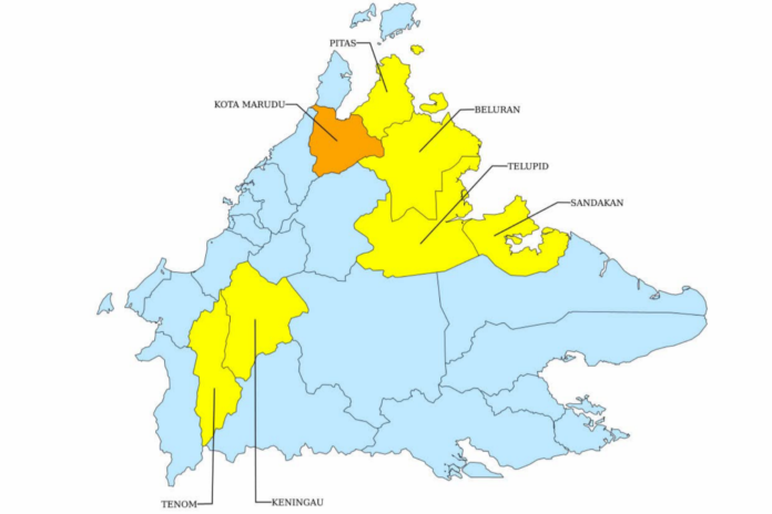 Antara kawasan yang berada pada tahap berjaga-jaga Pitas; Beluran; Telupid; Sandakan; Keningau dan Tenom.