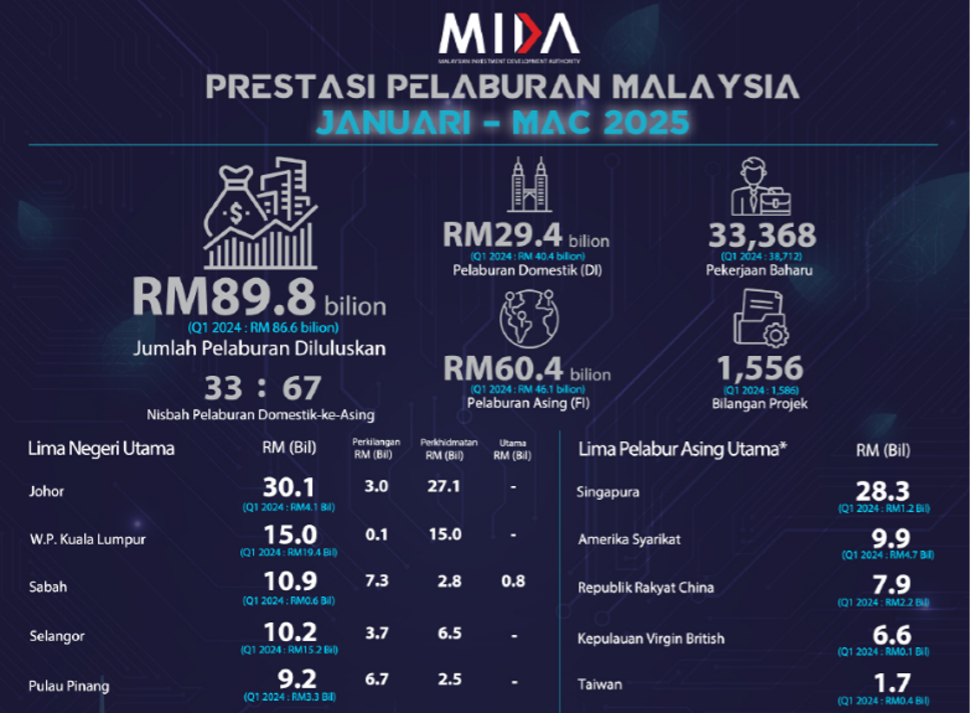 Berdasarkan laporan Lembaga Pembangunan Pelaburan Malaysia (MIDA), Sabah menerima pelaburan berjumlah RM10.9 bilion pada suku pertama 2025, iaitu ketiga terbesar selepas Johor dan Wilayah Persekutuan Kuala Lumpur.