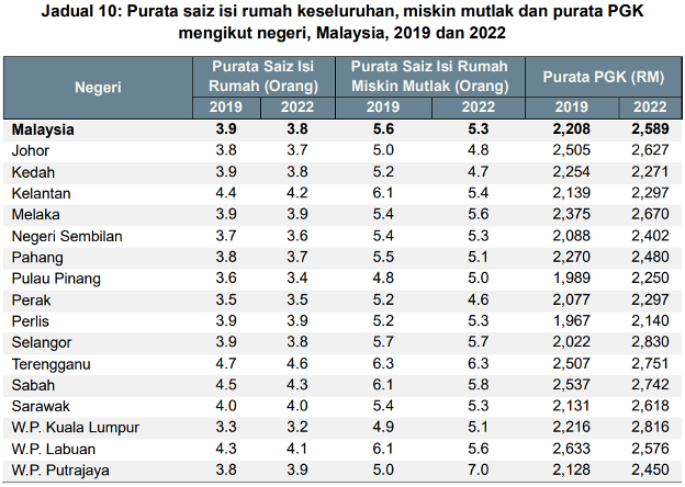 Satu lagi aspek penting dalam laporan DOSM ialah purata saiz isi rumah miskin mutlak, iaitu 5.3 orang — jauh lebih besar berbanding purata isi rumah negara (3.8 orang). Keadaan ini menuntut perhatian dasar yang lebih mendalam.