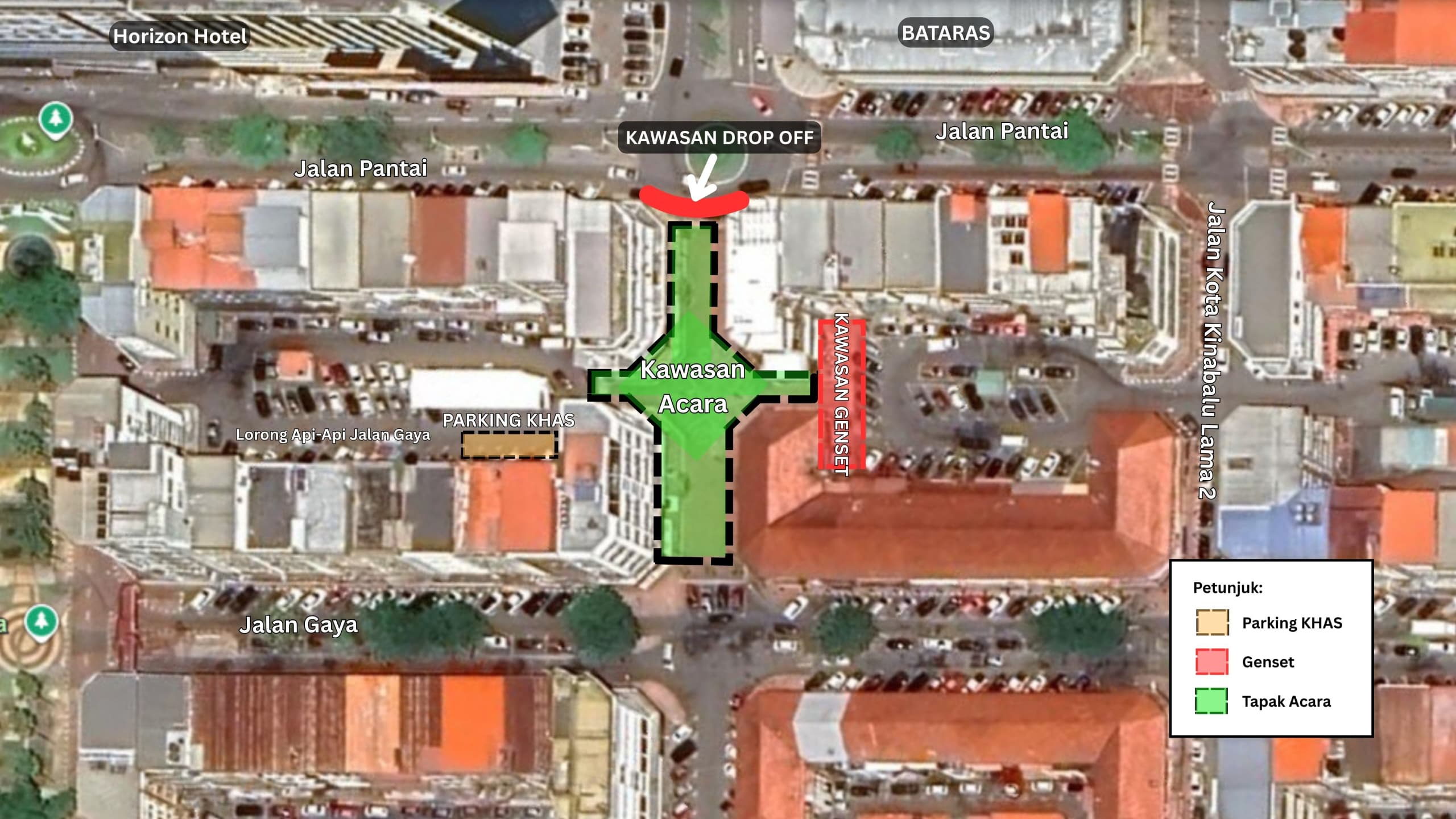 “Turut ditutup adalah tempat letak kereta di Lorong Api-Api, Jalan Gaya bagi dijadikan kawasan parkir khas bermula jam 2 petang pada Jumaat sehingga 10 malam pada Sabtu.