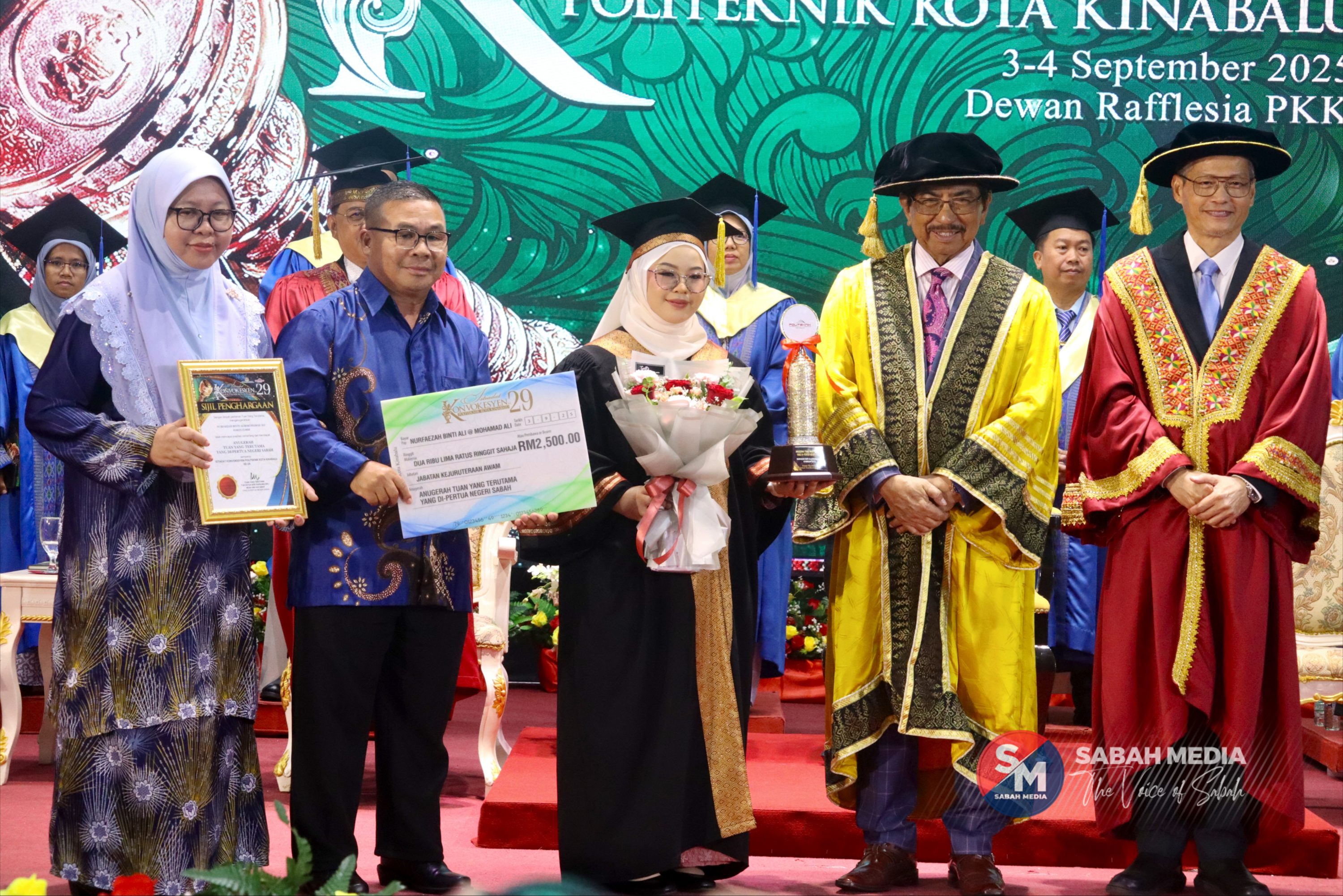 Anak bongsu dari tiga beradik itu diumumkan sebagai penerima anugerah tertinggi sempena Istiadat Konvokesyen Politeknik Kota Kinabalu (PKK) yang berlangsung di Dewan Rafflesia PKK di sini pada Rabu.