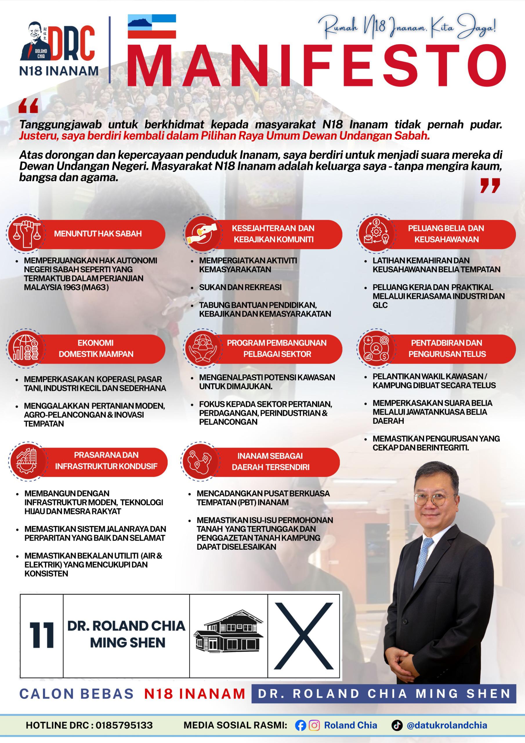 KOTA KINABALU : Sebanyak 10 aspirasi pembangunan menjadi antara tawaran calon Bebas bagi kawasan Dewan Undangan Negeri (DUN) Inanam Datuk Dr Roland Chia Ming Shen pada Pilihan Raya Umum Dewan Undangan Sabah (PRU Sabah) ke-17.