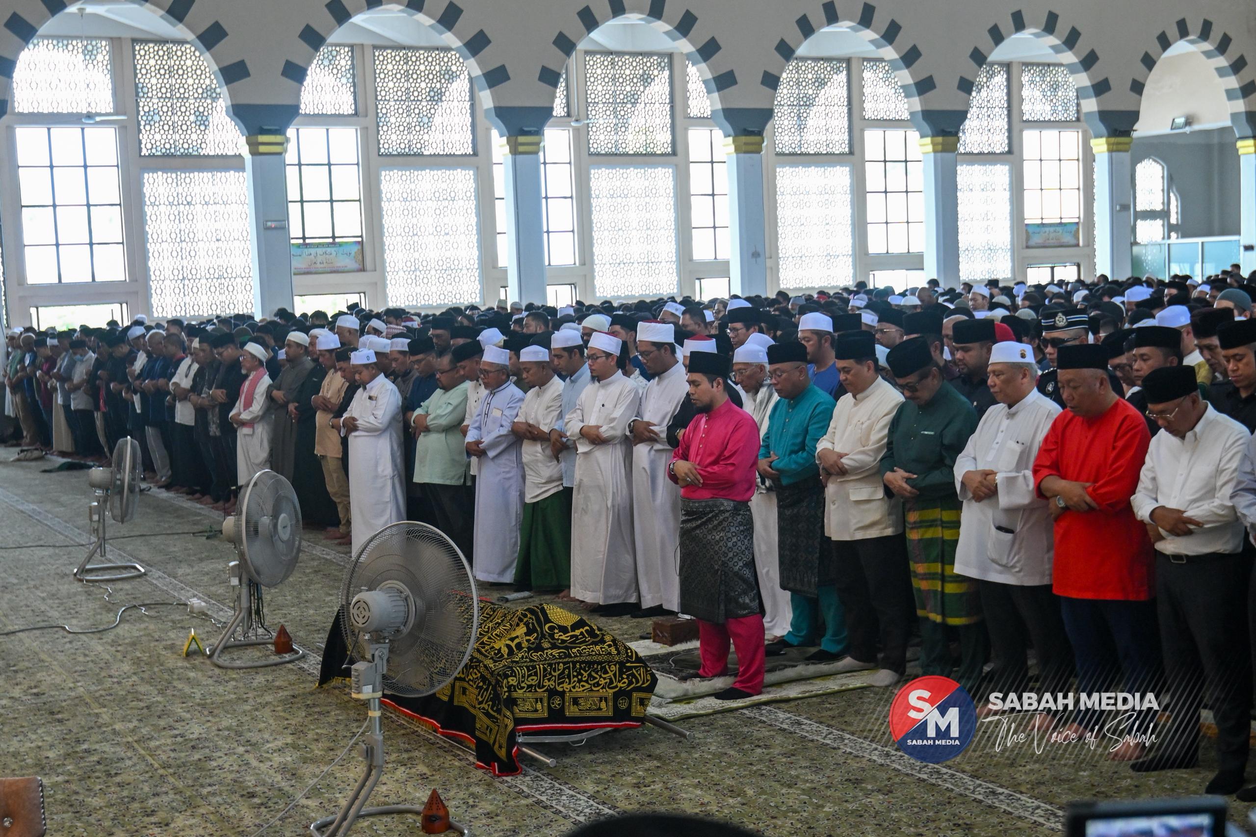 KOTA KINABALU: Ribuan umat Islam berhimpun di Masjid Bandaraya Kota Kinabalu, Likas, pada Jumaat untuk menunaikan solat jenazah Ahli Parlimen Kinabatangan, Allahyarham Datuk Seri Bung Moktar Radin, sejurus selesai solat Jumaat.