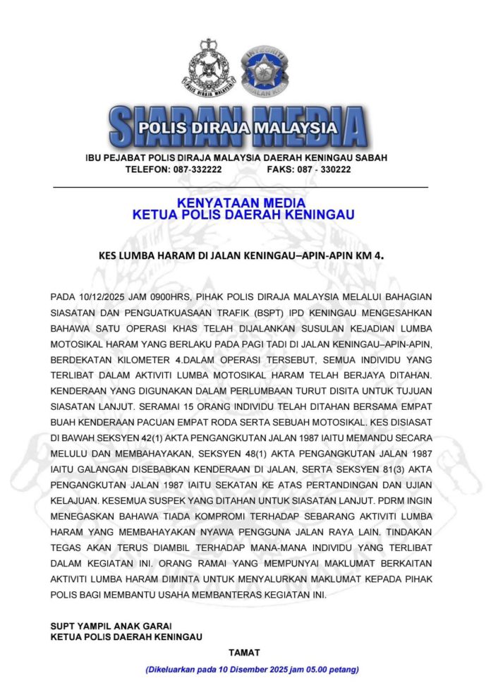 KENINGAU: Seramai 15 individu ditahan dalam satu operasi khas membanteras lumba motosikal haram yang dijalankan oleh Polis Diraja Malaysia (PDRM) di Jalan Keningau–Apin-Apin, berhampiran Kilometer 4, pagi tadi.