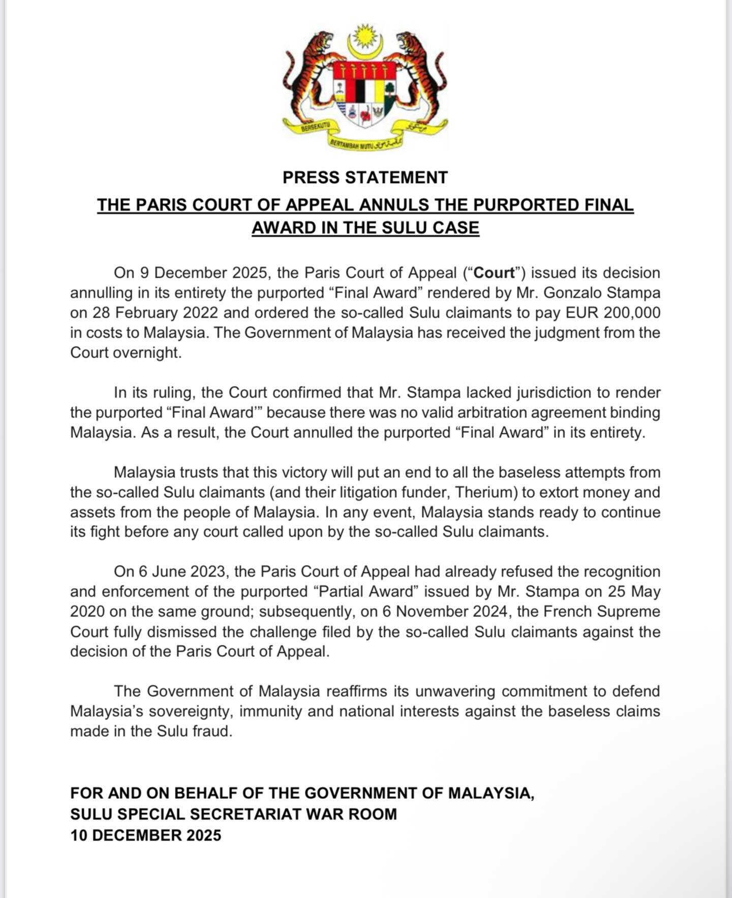 Mahkamah Rayuan Paris membatalkan sepenuhnya ‘Award Akhir’ yang dikeluarkan oleh penimbang tara Gonzalo Stampa pada 28 Feb 2022, dan mengarahkan penuntut Sulu membayar kos berjumlah €200,000 kepada Malaysia.