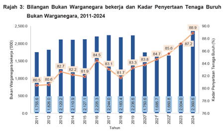 DOSM juga mendedahkan jumlah penduduk bukan warganegara yang bekerja meningkat 34 peratus daripada 1.756 juta orang pada 2011 kepada 2.361 juta orang pada 2024, dengan Kadar Penyertaan Tenaga Buruh (KPTB) bukan warganegara meningkat daripada 80.5 peratus (2011) kepada 88.9 peratus (2024). Ini menegaskan bahawa tujuan utama migrasi ke Malaysia ialah pekerjaan.