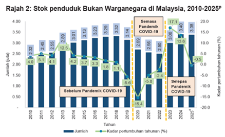 DOSM memaklumkan jumlah 3.38 juta itu menunjukkan penurunan kecil berbanding 3.40 juta orang pada 2024, dengan populasi bukan warganegara kini merangkumi 9.9 peratus daripada keseluruhan 34.1 juta penduduk Malaysia.