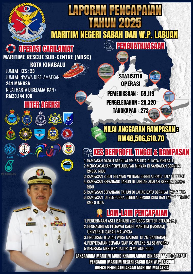 KOTA KINABALU : Agensi Penguatkuasaan Maritim Malaysia (Maritim Malaysia) Negeri Sabah dan Wilayah Persekutuan Labuan merekodkan sebanyak 273 kes tangkapan dengan nilai rampasan dianggarkan RM48.5 juta sepanjang tahun 2025 hasil penguatkuasaan berterusan dan operasi bersepadu di perairan negeri ini.