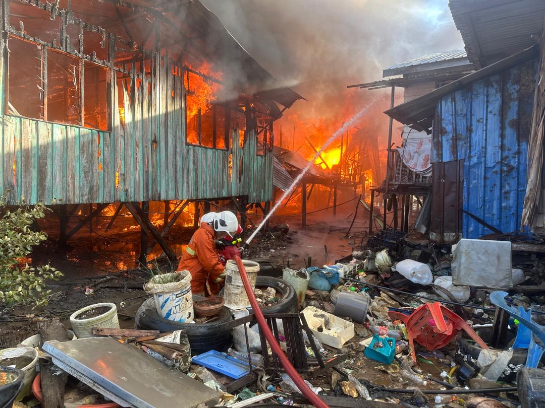 PUTATAN: Sebanyak 14 buah rumah atas air musnah, manakala tiga lagi mengalami kerosakan dalam kebakaran di Kampung Dumpil dekat sini, awal pagi Khamis (22 Jan).