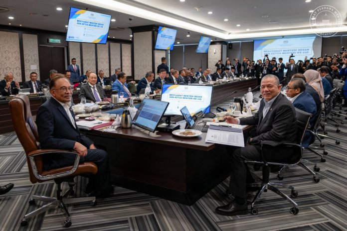 KUALA LUMPUR : Perdana Menteri Datuk Seri Anwar Ibrahim hari ini mempengerusikan Mesyuarat Menteri Besar dan Ketua Menteri ke-148 di Bangunan Parlimen di sini bagi memperkukuh penyelarasan gerak kerja antara pentadbiran Kerajaan Persekutuan dan kerajaan negeri.