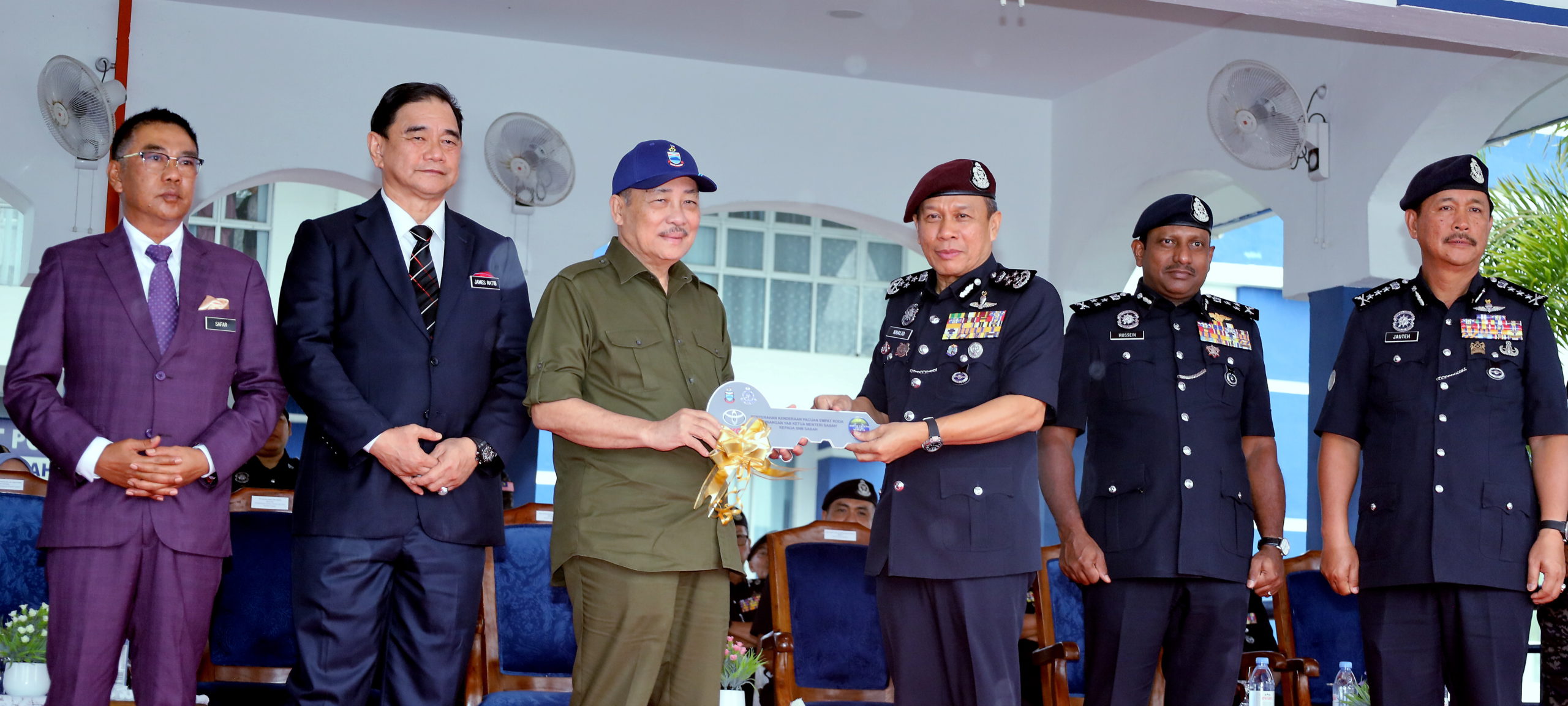 Ketua Menteri, Datuk Seri Hajiji Noor menyampaikan replika kunci kepada Ketua Polis Negara, Datuk Seri Mohd Khalid Ismail sebagai simbolik penyerahan sumbangan dalam satu majlis di Padang Kawad Ibu Pejabat Polis Kontinjen Sabah, Kepayan, di sini, hari ini.