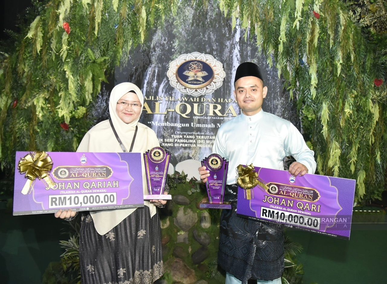 KOTA KINABALU : Pakar bedah mata, Dr Muhammad Hazim Sharum,37, dan guru agama Nur Faten Izzati Rablin,34, masing-masing dinobatkan johan qari dan qariah pada Majlis Tilawah Al-Quran Peringkat Negeri Sabah (MTHQNS) 1447H/2026M.