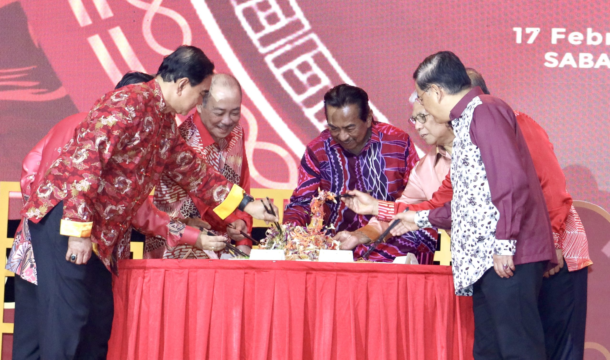 Tun Musa dan Hajiji bersama tetamu kenamaan lain menggaul Yee Sang sempena Majlis Rumah Terbuka Tahun Baharu Cina Kerajaan Negeri di SICC pada Selasa.
