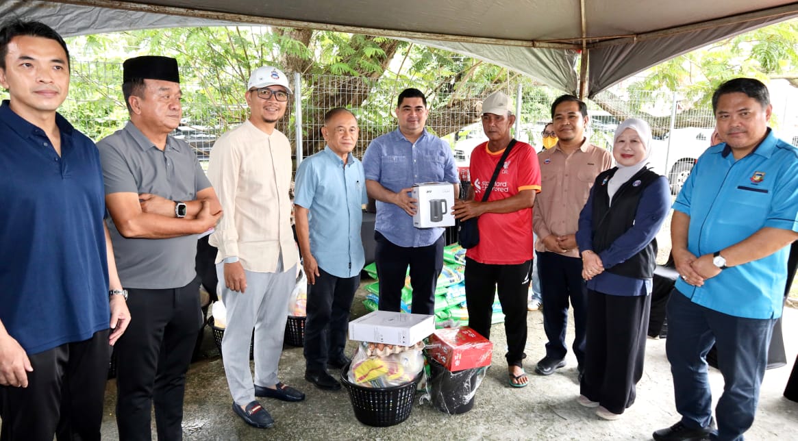 Ahli Parlimen Putatan, Datuk Shahelmey Yahya dan Pengarah Yayasan Kebajikan Sabah (YKS), Datuk Diyanah Abdullah menyampaikan sumbangan tersebut di Pusat Pemindahan Sementara (PPS) Kampung Sembulan.