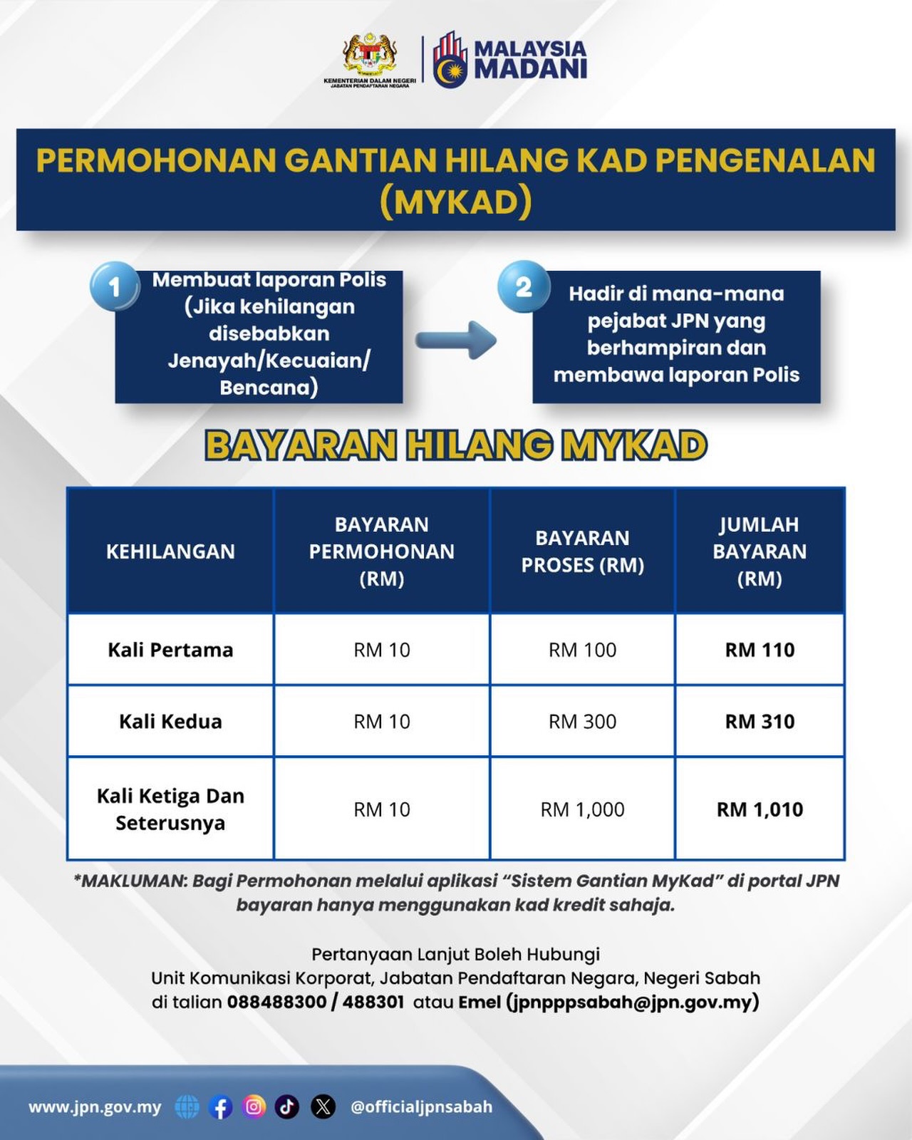 Jabatan Pendaftaran Negara (JPN) Sabah, dalam kenyataan menerusi Facebook rasminya, memaklumkan bahawa sekiranya kehilangan berpunca daripada jenayah, kecuaian atau bencana, pemohon hendaklah membuat laporan polis terlebih dahulu sebelum hadir ke mana-mana pejabat JPN yang berdekatan.