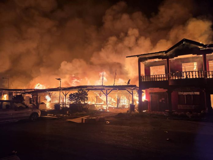 SANDAKAN: Kira-kira 200 rumah atas air musnah dalam kebakaran di Kampung Bahagia, di sini, awal pagi tadi.