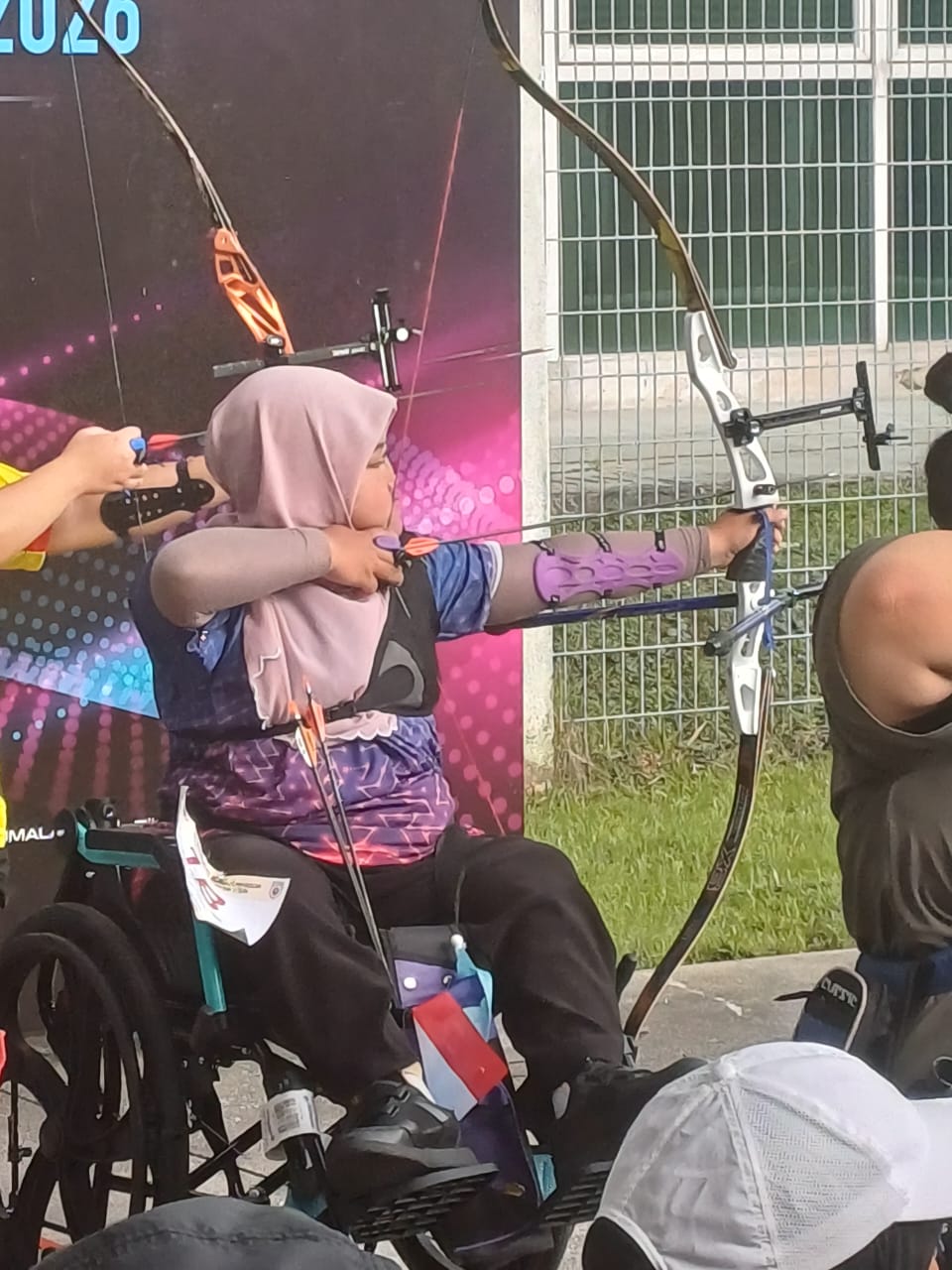 KOTA KINABALU: Pelajar berusia 13 tahun, Nurkhadijah Husna Budiman dari Sekolah Menengah Kebangsaan (SMK) Inanam berjaya menewaskan tiga peserta senior sekali gus merangkul pingat emas acara Recurve Wanita Kategori 2 pada Kejohanan Sirkit Para Memanah Kebangsaan Siri 1.