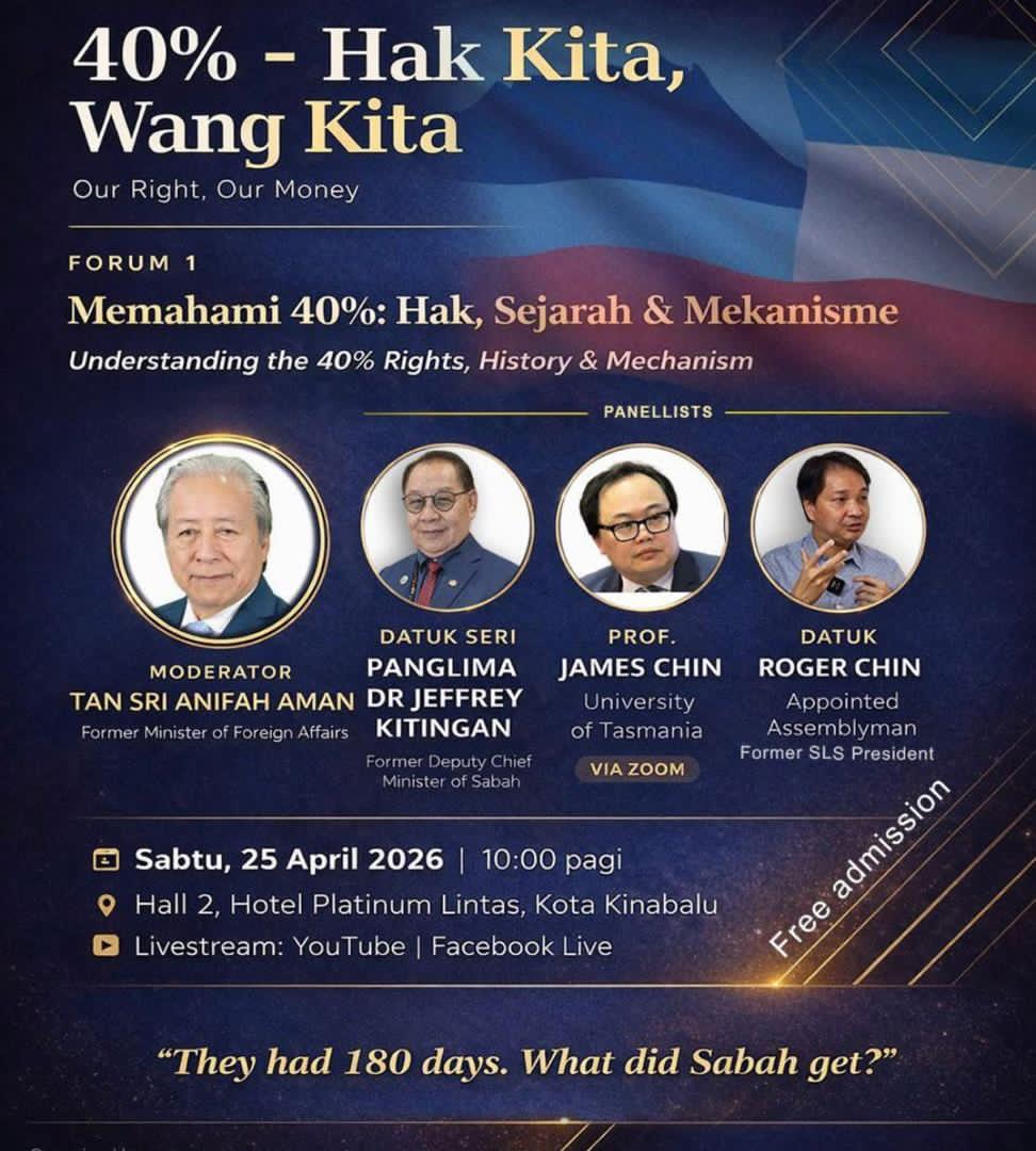 KOTA KINABALU: Orang ramai dijemput dan dipelawa untuk menghadiri forum awam bertajuk ‘40% Hak Kita, Wang Kita’ yang akan berlangsung Sabtu ini, di Hall 2, Hotel Platinum Lintas, di sini.