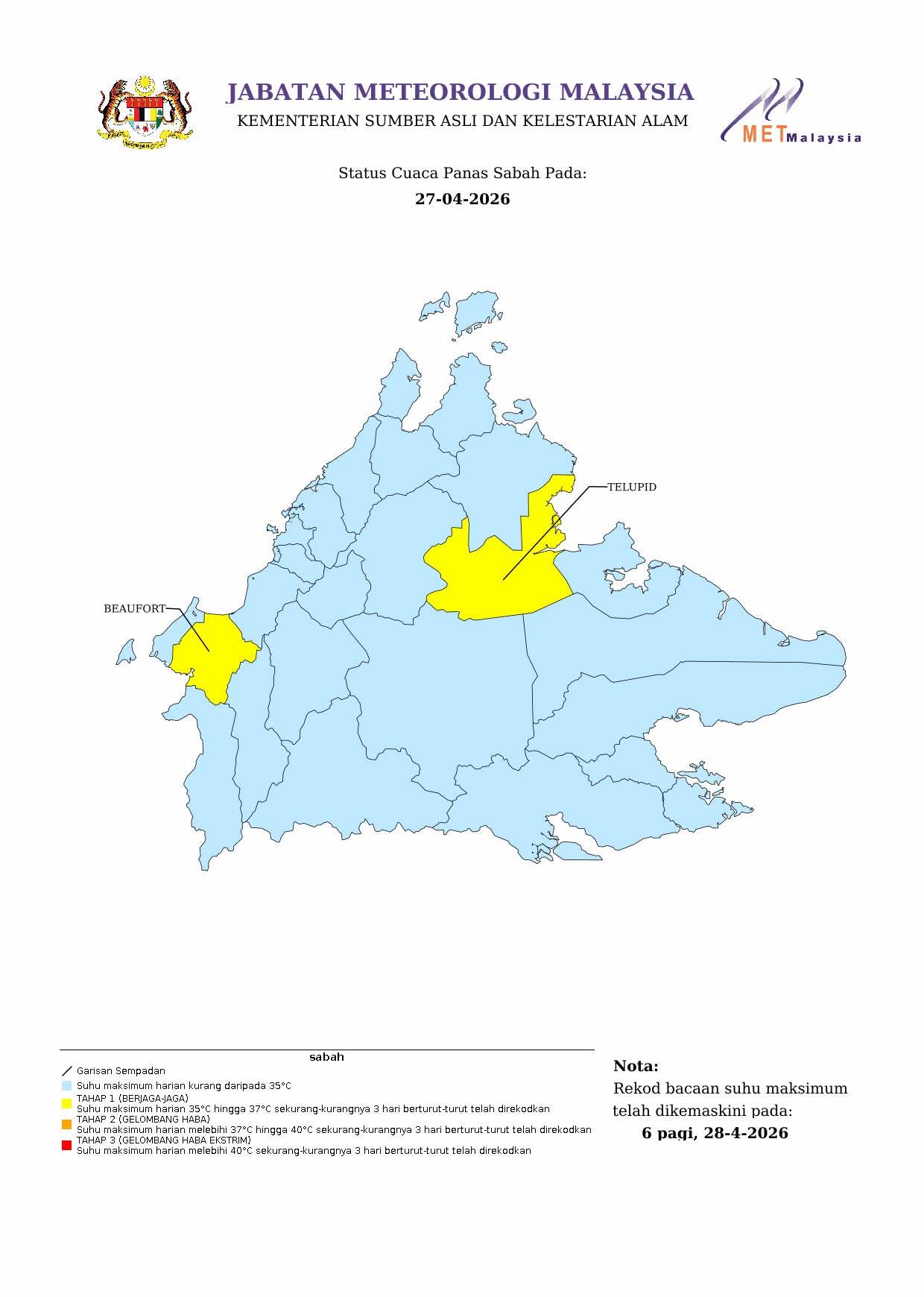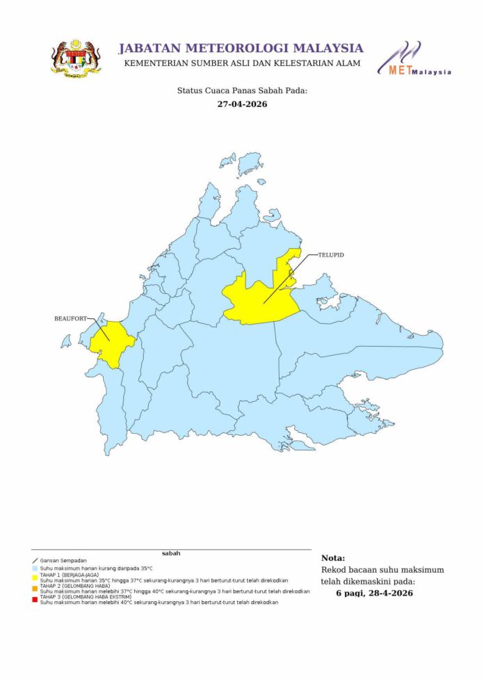 KOTA KINABALU : Dua daerah di Sabah dilaporkan mengalami cuaca panas tahap berjaga-jaga yang boleh mencecah suhu sehingga 37 darjah celcius.